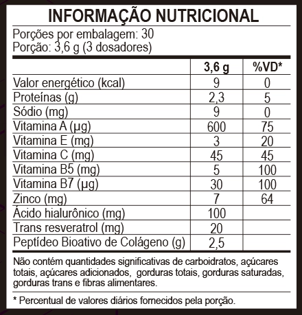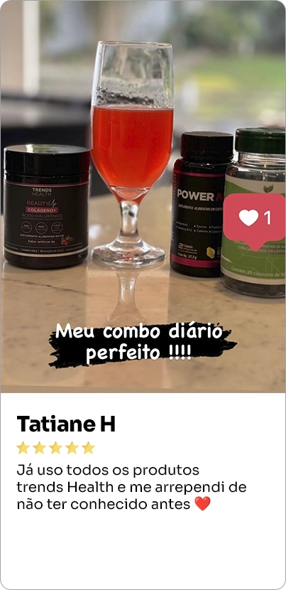 O colágeno Trends Health é produzido com ingredientes 100% naturais e não causa efeitos colaterais, porém, por possuir o ácido hialurônico em sua composição, recomendamos que gestantes, lactantes e crianças consultem um médico para avaliação da possibilidade de consumo antes da compra.